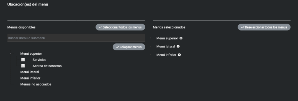 Una vez que hayas creado o editado tu menú, desplázate al final de la página y encontrarás la opción para seleccionar su ubicación. Si no seleccionas una nueva ubicación, el menú se mantendrá en la ubicación actual. Si eliges dos ubicaciones, el menú será visible en ambas. Ten en cuenta que si editas o eliminas el menú, los cambios afectarán a las dos ubicaciones.