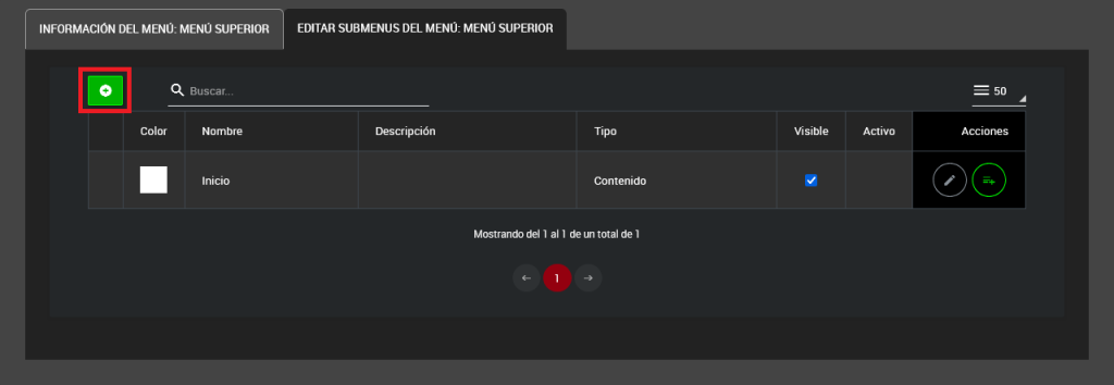 Ahora que has seleccionado la ubicación de tu menú, es hora de crear uno nuevo. Para hacerlo, haz clic en el botón verde que se encuentra en la parte superior izquierda de la tabla de menús. Este botón abrirá un formulario donde podrás definir la configuración básica de tu menú.