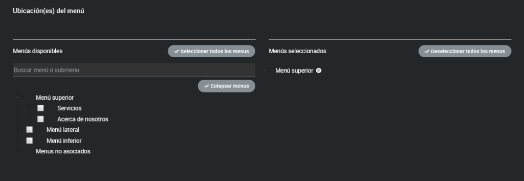 Ubicación(es) del Menú: Este campo te permite elegir las ubicaciones donde se mostrará el menú en tu sitio. Si no seleccionas ninguna ubicación, el menú se ubicará por defecto en la raíz.