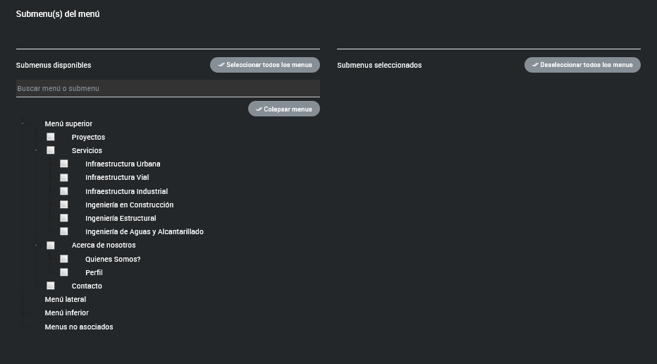 Submenú(s) del menú: Esta opción permite asignar el menú creado como parte de un submenú dentro de un menú principal existente, organizando la estructura jerárquica de navegación y mejorando la experiencia del usuario.