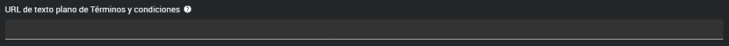 URL de Texto Plano de Términos y Condiciones: Especifica la URL que enlaza a los términos y condiciones en formato de texto plano. Esta URL puede dirigir a un archivo descargable o a una página que muestre el contenido en este formato. Este texto se visualizará directamente en la interfaz del sitio, sin necesidad de redirigir al usuario a otra página externa.