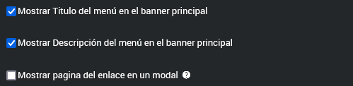Mostrar Descripción del menú en el banner principal: Al marcar esta opción, se incluirá la descripción asociada al menú en el banner principal, proporcionando un contexto adicional o detalles relevantes sobre el contenido.
