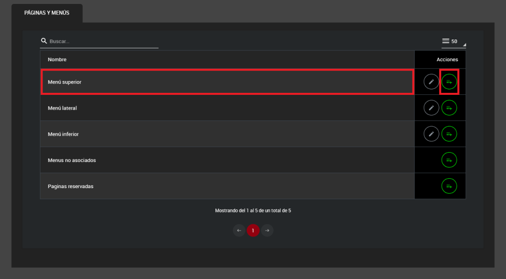 Una vez dentro de la sección de Páginas y Menús, verás diferentes ubicaciones disponibles donde puedes crear tu menú. Para seleccionar la ubicación, simplemente haz clic en el nombre de la sección que deseas utilizar, o en el botón ubicado en la columna de acciones. Esto te permitirá elegir el área de tu página web donde el menú será visible.