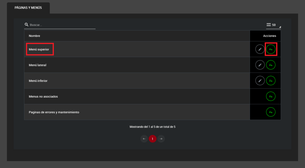 Selecciona la sección donde deseas crear o editar un menú. Para ello, puedes hacer clic en el nombre de la sección o en el botón correspondiente ubicado en la columna de acciones.