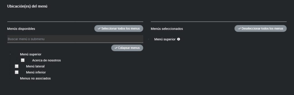 Ubicación(es) del Menú: Este campo te permite elegir las ubicaciones donde se mostrará el menú en tu sitio. Si no seleccionas ninguna ubicación, el menú se ubicará por defecto en la raíz.