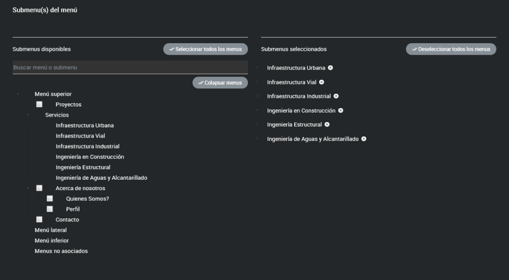 Submenú(s) del menú: Esta opción permite asignar el menú creado como parte de un submenú dentro de un menú principal existente, organizando la estructura jerárquica de navegación y mejorando la experiencia del usuario.
