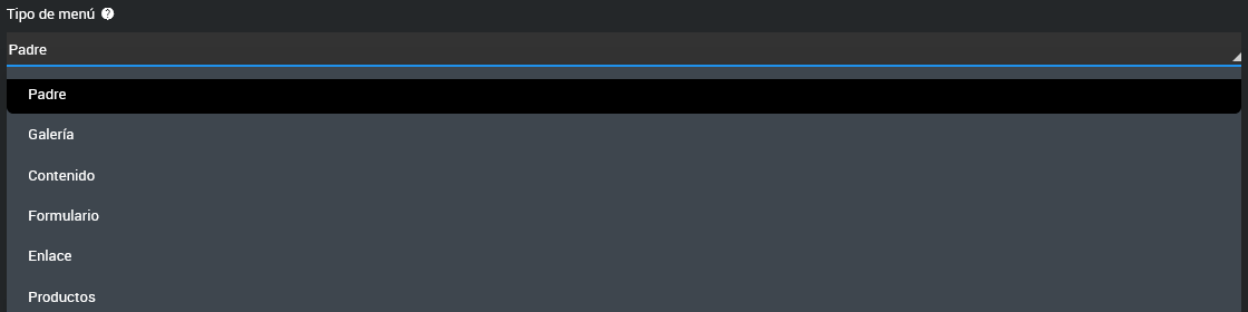 Tipo de menú: Selecciona el tipo de contenido que se mostrará. Consulta el siguiente FAQ para entender los distintos tipos disponibles.
