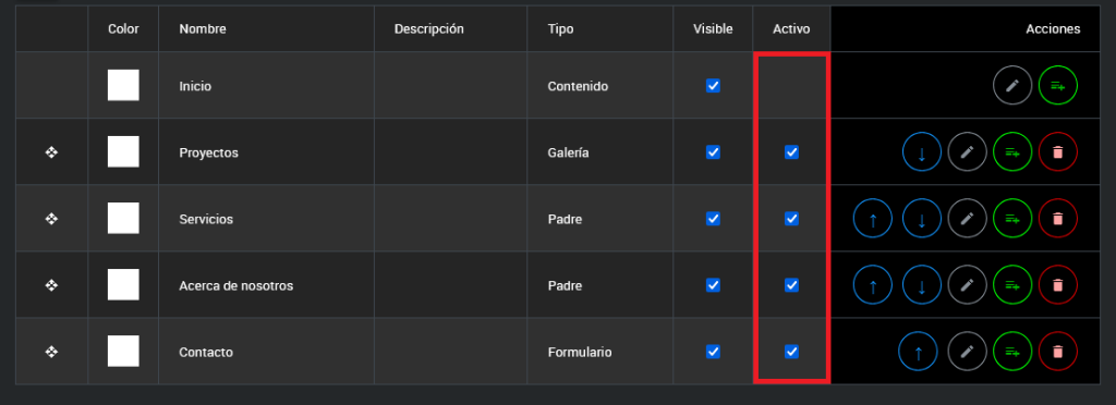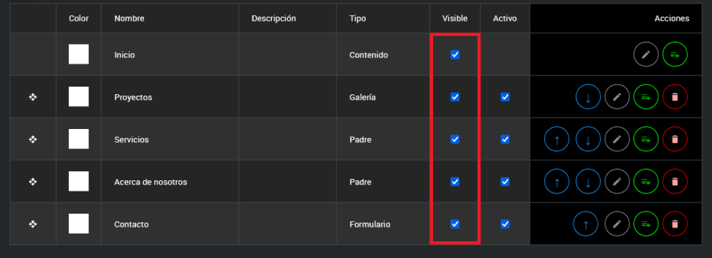 Las herramientas de Activo y Visible son una solución versátil para administrar la estructura de navegación, asegurando que el contenido esté siempre alineado con la estrategia de tu sitio.