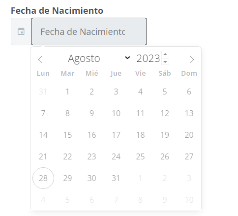 Fecha de nacimiento: Presenta un selector para elegir y validar día, mes y año.