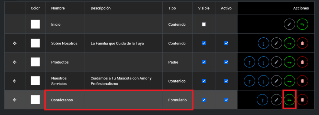 Accede a la lista de menús disponibles en la administración y localiza el menú correspondiente al formulario que contiene el campo que necesitas editar. Una vez que lo identifiques, selecciona su nombre o haz clic en el botón verde con un ícono de barras y un símbolo de más, ubicado en la fila correspondiente. Esto te llevará a la configuración de ese formulario.