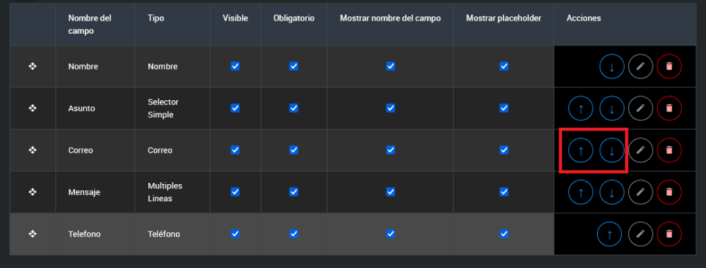 Dentro de la pestaña “Campos del formulario”, encontrarás una tabla con todos los campos configurados para ese formulario. Localiza el campo que deseas reordenar y elige entre las dos opciones disponibles para modificar su posición: