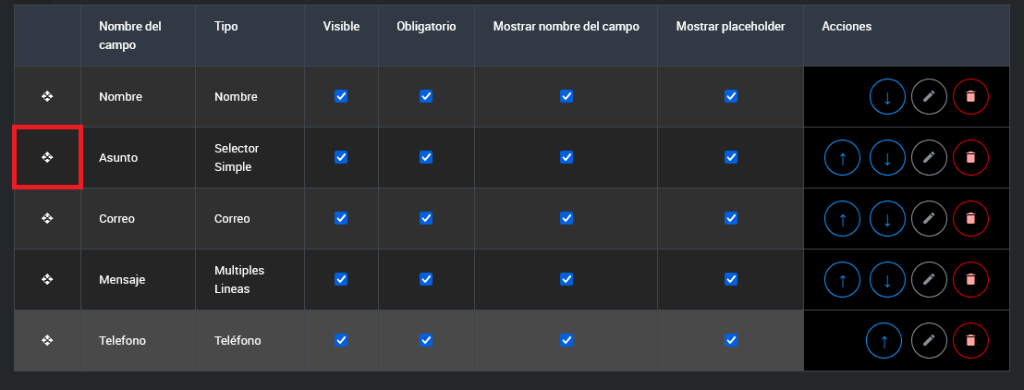 Arrastrar y soltar: Usa el ícono de las cuatro flechas ubicado en la primera columna de cada fila. Haz clic y mantén presionado mientras arrastras el campo a la posición deseada. Suelta el clic para colocar el campo en su nueva ubicación.