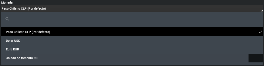 Moneda: Aquí puedes seleccionar la moneda en la que se realizará la transacción para este producto. Por defecto, la moneda establecida es el peso chileno (CLP).