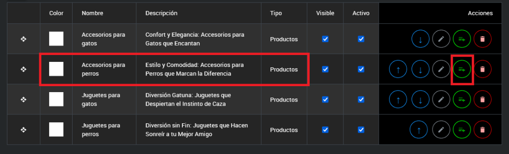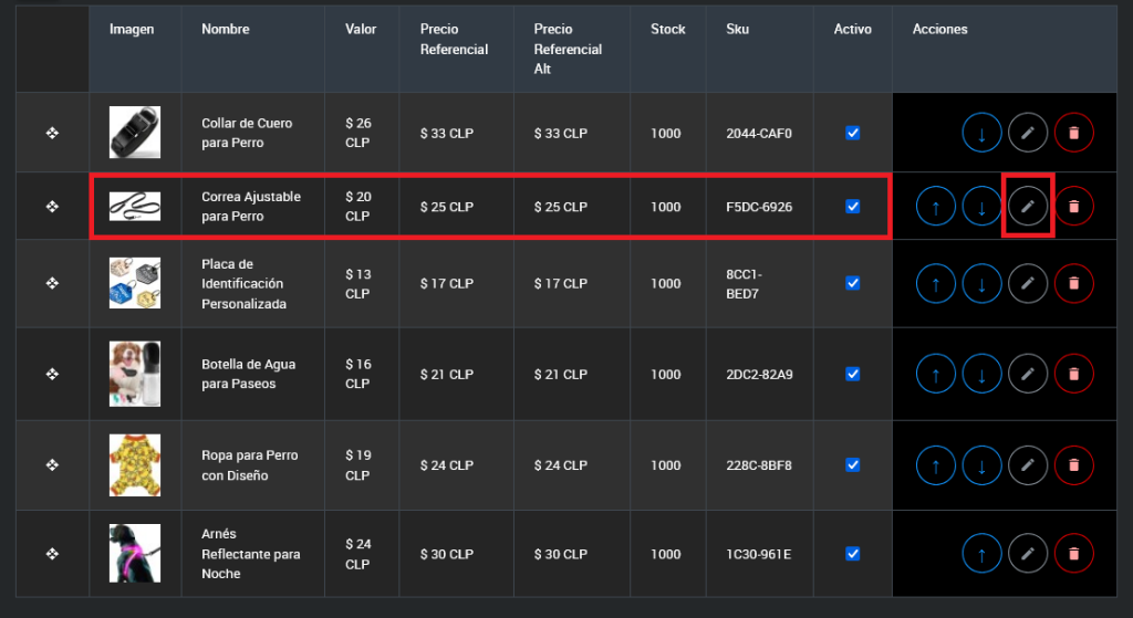 Una vez dentro del menú de productos, encontrarás una tabla con todos los productos existentes. Identifica el producto al que deseas añadir/editar su informacion SEO y haz clic en el botón con el ícono de lápiz en su fila correspondiente para editarlo.