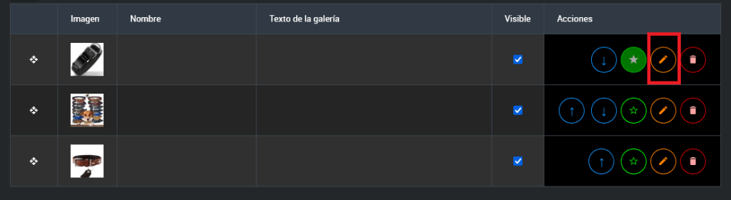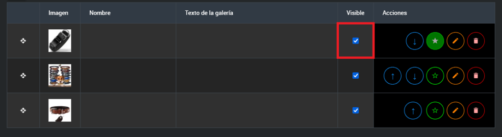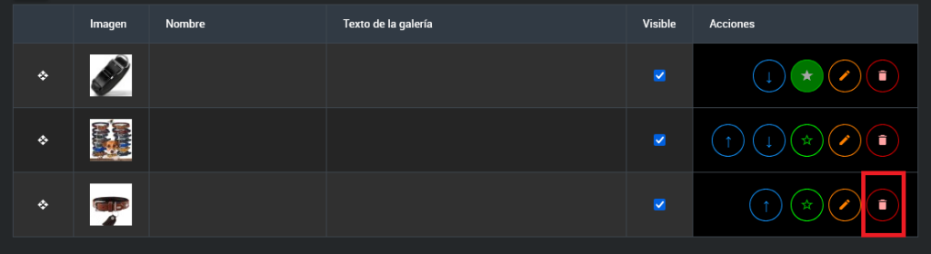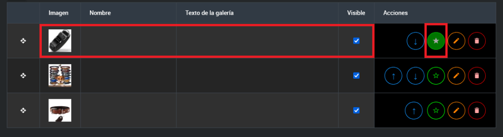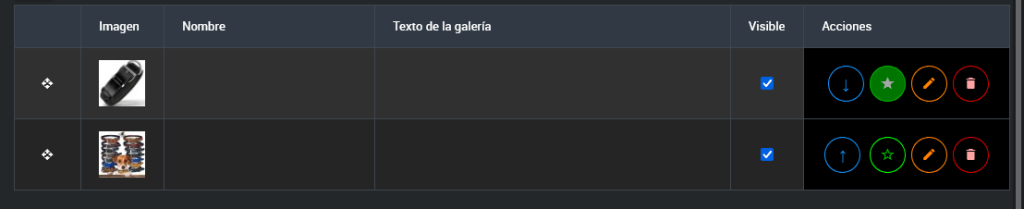 • Botones de subir y bajar: En la columna de acciones, utiliza los botones para mover la imagen una posición hacia arriba o hacia abajo dentro de la tabla.