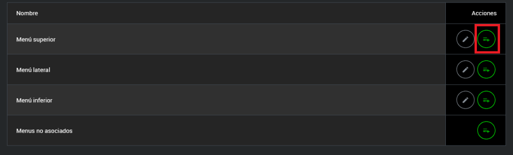 Selecciona el menú que deseas editar, generalmente el menú superior, y haz clic en el botón verde con un ícono de barras y un símbolo de más.
