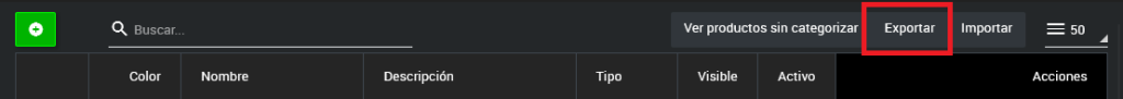 Dentro del submenú de productos, localiza el botón “Exportar”, que se encuentra en la parte superior de la tabla. Al hacer clic, se desplegará un modal que te permitirá configurar las opciones de exportación según tus necesidades.
