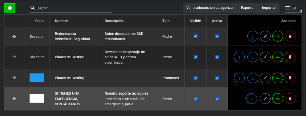 En la siguiente vista, se cargarán los menús de tipo padre y su, como el menú de productos. Si el menú padre tiene un submenú asociado producto, este aparecerá automáticamente.