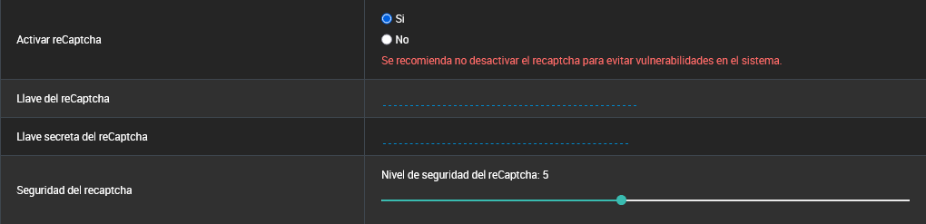 • Llave del recaptcha: Proporcionada al registrar tu sitio en Google reCaptcha.