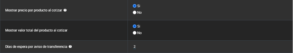 • Mostrar valor total del producto al cotizar: Permite mostrar el total de la cotización.