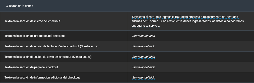 En el panel de configuración, despliega el acordeón “Textos de la tienda”. Este apartado te permite personalizar los mensajes y títulos que aparecen en distintas secciones del checkout y los correos de confirmación.