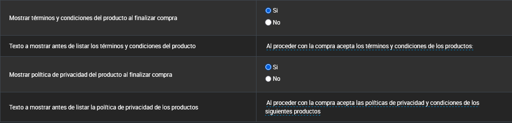 • Mostrar términos y condiciones del producto al finalizar la compra. Activa esta opción si necesitas que el cliente acepte términos específicos antes de completar la compra.