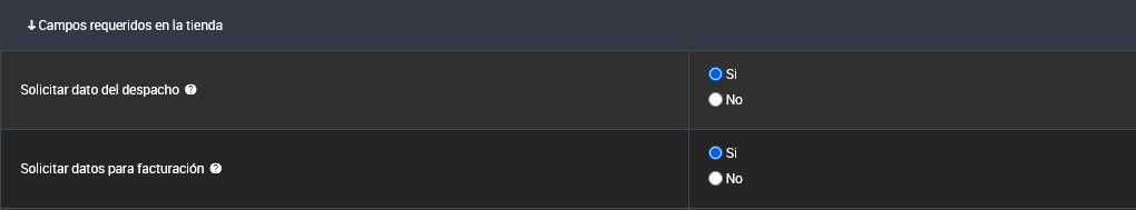 En el panel de configuración, despliega el acordeón “Campos requeridos en la tienda”. Define los datos que tus clientes deberán proporcionar para completar una compra: