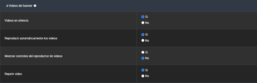 En el panel de configuración, despliega el acordeón “Videos del banner”. Aquí encontrarás todas las opciones relacionadas con los videos que se muestran en el banner principal de tu sitio.