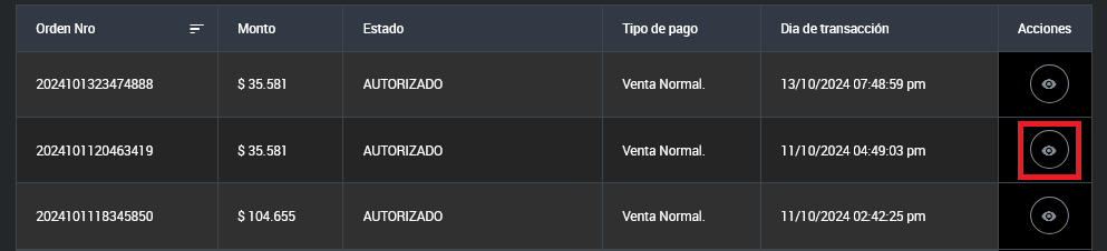 Localiza la transacción que deseas revisar en el listado y haz clic en el botón con el ícono de ojo que aparece en la columna de acciones.