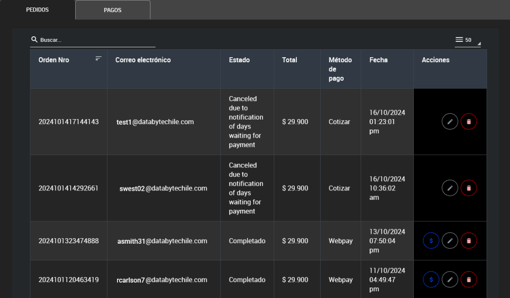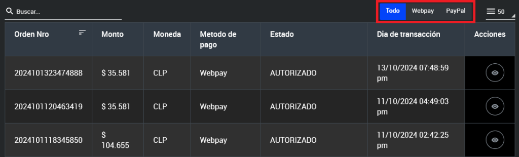 Si deseas consultar todas las transacciones procesadas mediante Webpay o PayPal, haz clic en la pestaña Pagos ubicada en la parte superior de esta sección.