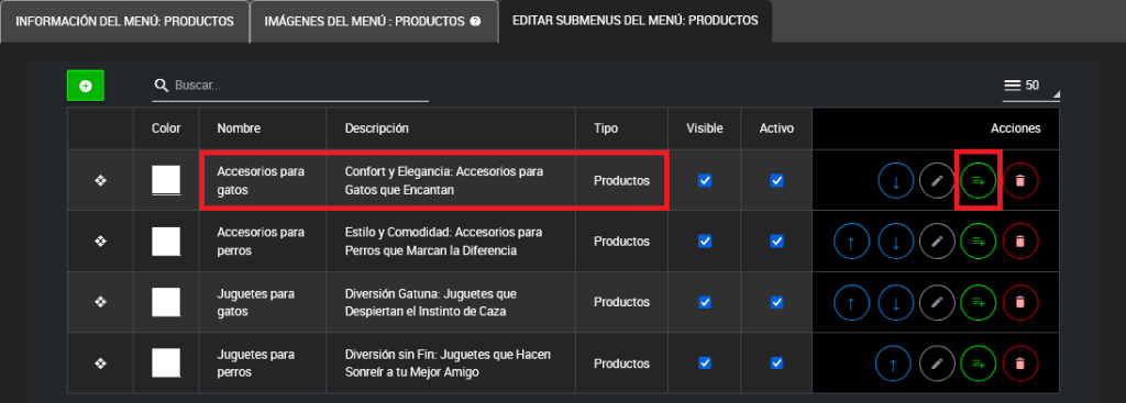 Si aún no has creado un menú de tipo producto, consulta nuestra guía para crear menús antes de continuar. Si ya tienes un menú de tipo producto, identifícalo en la lista de menús y selecciona su nombre o haz clic en el botón verde con un ícono de barras y un símbolo de más, ubicado en la fila correspondiente. Esto te llevará a la sección donde podrás gestionar y añadir productos.