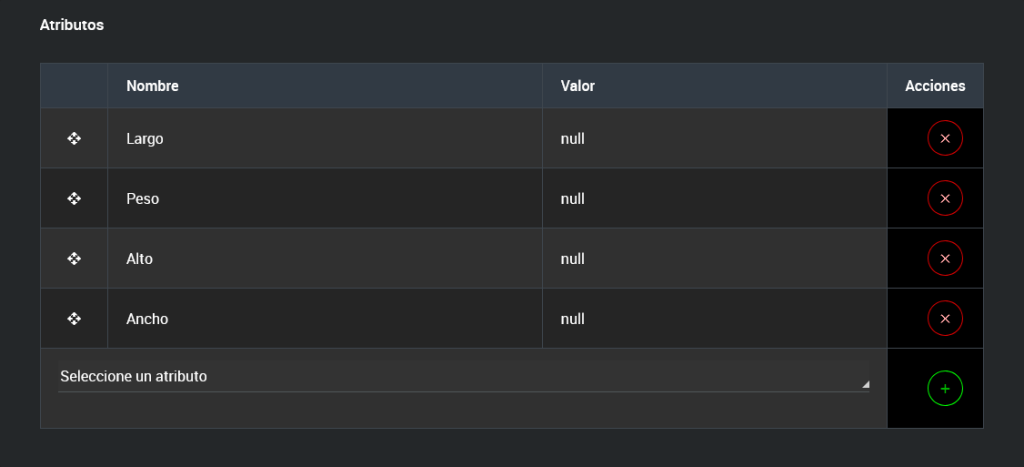 Si necesitas reorganizar el orden de los atributos, haz clic en el ícono de cuatro flechas en la primera columna de la tabla y mantén presionado el botón izquierdo del mouse mientras arrastras el atributo a la posición deseada. Si deseas eliminar un atributo, haz clic en el botón con el ícono de papelera ubicado en la última columna de la fila correspondiente. Es importante tener en cuenta que eliminar un atributo de la tabla no lo elimina permanentemente; puedes añadirlo nuevamente en cualquier momento desde el selector.