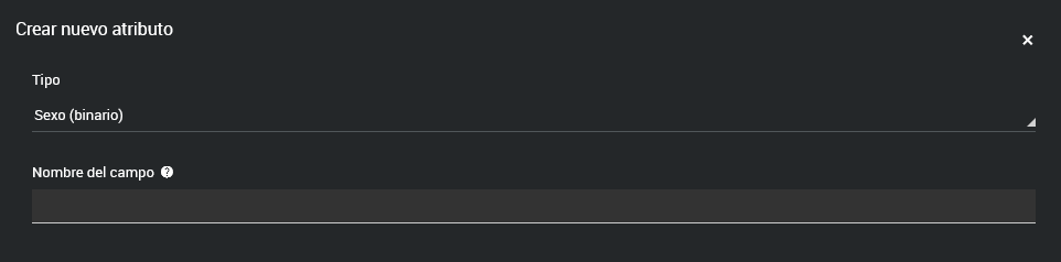 Para Sexo (binario) y Sexo (inclusivo), solo debes ingresar el nombre del campo. Las opciones predefinidas de selección aparecerán automáticamente como botones de radio en la tabla.