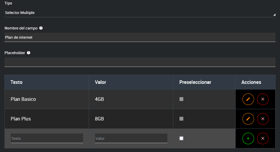 Para los atributos de tipo selector, además de ingresar el nombre del campo y el placeholder correspondiente, se mostrará una tabla donde puedes crear las opciones específicas de cada selector. Cada opción debe incluir un nombre, un valor y la posibilidad de definir cuál será la opción preseleccionada por defecto.