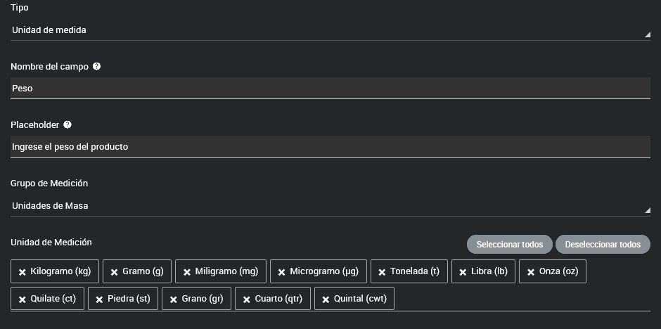 Una vez elegido el grupo, selecciona una, varias o todas las unidades de medida necesarias. Estas se mostrarán como etiquetas, y podrás eliminarlas haciendo clic en la “X” junto a su nombre.