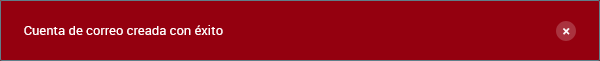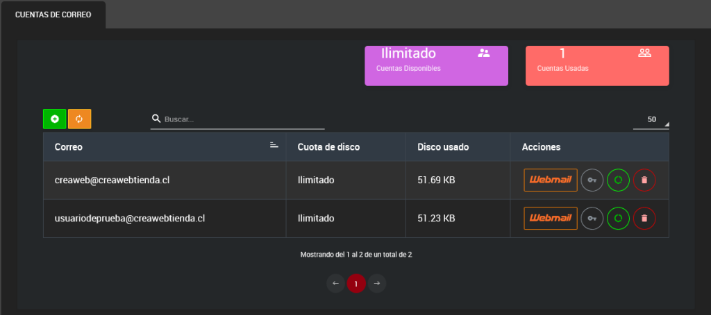 Si los datos son correctos, recibirás una notificación confirmando que la cuenta de correo se ha creado con éxito. Y la nueva cuenta de correo se visualizara en la tabla de la vista principal.