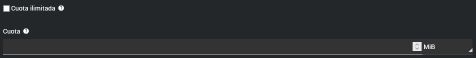Cuota ilimitada: Marca esta casilla si deseas asignar una cuota ilimitada a la cuenta de correo. Esto significa que la cuenta podrá usar el espacio en disco disponible del dominio menos el espacio usado por otras cuentas. Si no seleccionas esta opción, deberás ingresar manualmente un límite en MiB o GiB.