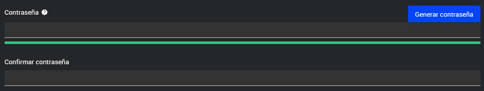 Si prefieres no crear la contraseña manualmente, haz clic en el botón de generación automática, ubicado en la esquina superior derecha del campo. Esto llenará automáticamente los campos de contraseña y confirmación. No olvides hacer clic en el botón de copiar contraseña y guardarla en un lugar seguro.