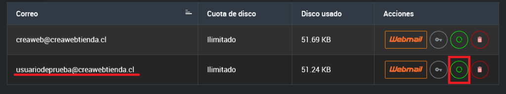 En esta sección, encontrarás una tabla que muestra todas las cuentas de correo creadas, junto con su información general y la cantidad de cuentas disponibles para crear.