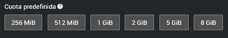 Cuotas predefinidas: Para mayor comodidad, puedes seleccionar una de las cuotas predefinidas disponibles, ubicadas en la parte inferior del modal. Los valores preestablecidos son: 256 MiB, 512 MiB, 1 GiB, 2 GiB, 5 GiB y 8 GiB. Al seleccionar cualquiera de estas opciones, el campo de cuota se llenará automáticamente.
