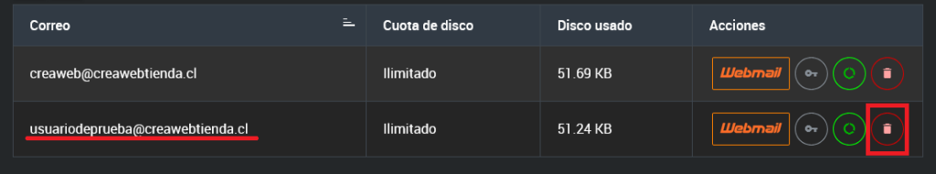 En esta vista, encontrarás una tabla que muestra todas las cuentas configuradas y disponibles, junto con detalles como el nombre del correo, el dominio asociado y la cuota asignada. Identifica la fila correspondiente a la cuenta de correo que deseas eliminar.