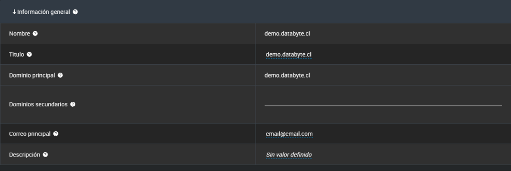 Haz clic y despliega el acordeon/pestaña de Informacion general. Como podras observar en este bloque se encuentra informacion basica de tu sitio web.