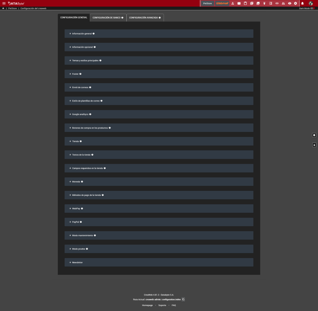Esto te llevara a la siguiente vista, en la cual estan todas las configuraciones de tu sitio en creaweb. Las configuraciones estan ocultas en acordeones. Para desplegarlas haz clic en el bloque que quieras configurar y así ver su contenido.