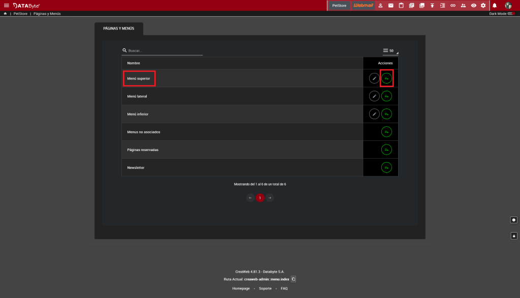 Para empezar a configurarla vas a la vista principal de la administración de creaweb y haces clic en “Menú Principal” o en el boton verde con el icono de barras en la misma fila.