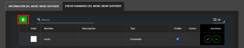 Opción rápida: Haz clic en el botón verde con el signo “más” que está en la esquina superior izquierda de la tabla. Esto te llevará directamente al área de “Crear Contenido”.