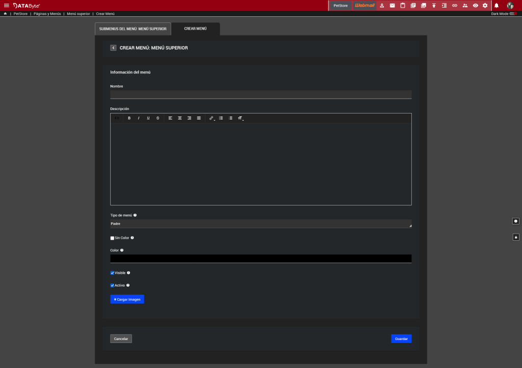 Sin color: si marcas la opción Sin color y no tienes una imagen activa para este menú, el banner principal de la página solo mostrará el texto (Nombre y Descripción) sin ningún fondo de color.
