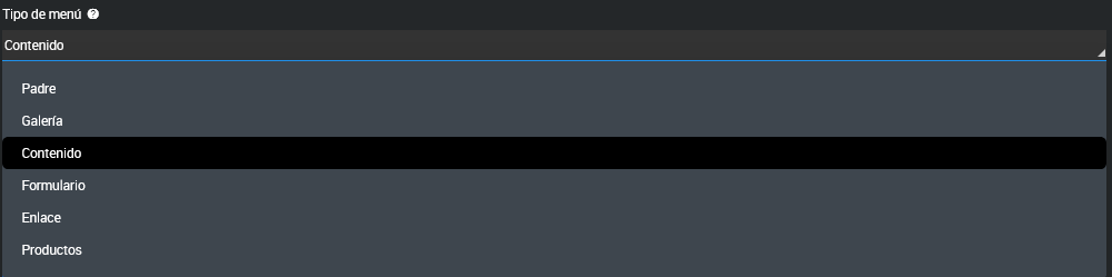 Para configurarla en Creaweb, solo necesitas seguir el mismo proceso que utilizas para crear un nuevo menú. La única diferencia es que, en este caso, debes seleccionar la opción “Contenido” como tipo de menú. Una vez elegida, se abrirá la pestaña “Información del menú: [Nombre del menú]”, que contiene los datos básicos que ingresaste al crearlo.