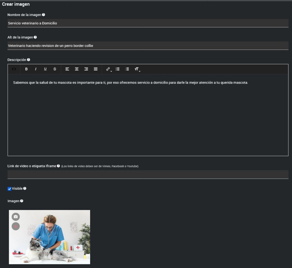 En el apartado Imagen, haz clic en el botón con el icono de cámara para subir una imagen desde tu computadora. Una vez cargada, podrás verla en la vista previa.