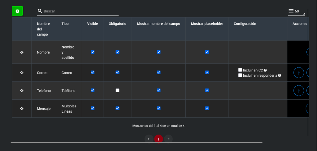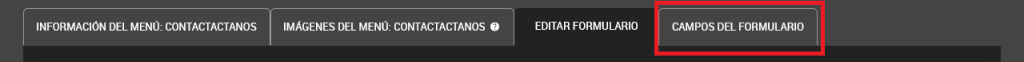 Después de guardar, se habilitará una nueva pestaña llamada “Campos del Formulario”. Haz clic ahí para definir los campos específicos (como “Nombre”, “Correo”, “Mensaje”) que deseas que tenga tu formulario de contacto.