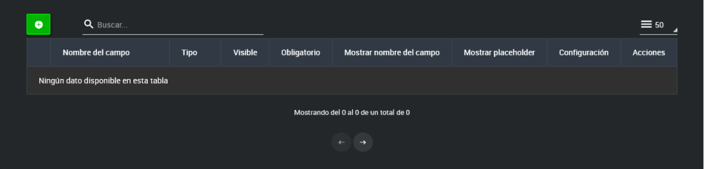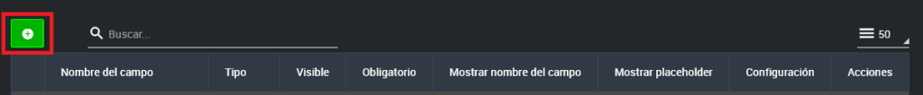 Para añadir un nuevo campo, haz clic en el botón verde ubicado en la esquina superior izquierda de la tabla o desplázate directamente a la sección de creación.